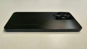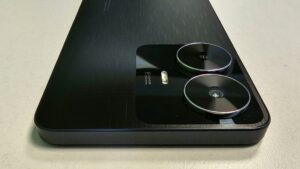 Il design di Realme C55 è classico ma piacevole. Bella la cornice piatta della scocca, che offre un ottimo grip e dona all’insieme una certa eleganza. Elegante la finitura della cover, con linee sfuggenti e leggermente in rilievo. La parte posteriore è caratterizzata dalla generosa isola tecnica che ospita le fotocamere: ci sono due grandi oblò, appena sporgenti rispetto al profilo, compresi in una porzione lucida, che contrasta con la finitura satinata del guscio posteriore. Il perimetro è pressochè sgombro, salvo per la presenza del carrellino porta Sim sul lato sinisto e di tutte le connessioni su quello inferiore.