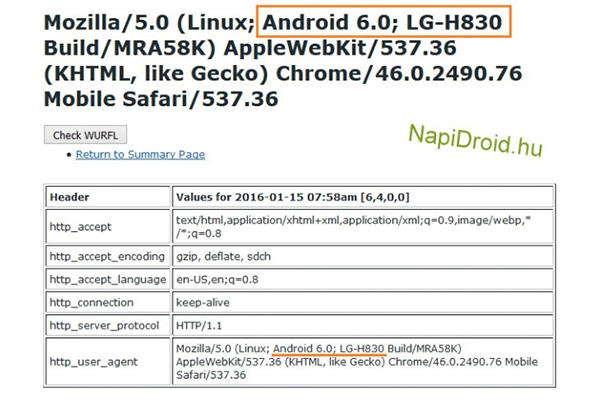 Ci sono nuove conferme sull’arrivo del G5 al Mobile World Congress 2016 di Barcellona. Dopo gli inviti stampa spediti a tutte le redazioni di settore, dalla Rete arriva un nuovo report che anticipa il codice modello di quello che dovrebbe essere il prossimo top di gamma del produttore coreano. Nel dettaglio, è stato effettuato un accesso alla rete Internet con un user agent che non lascia scampo: LG-H830, con sistema operativo Android Marshmallow 6.0. Non è trapelato nessun dettaglio riguardante le specifiche tecniche del dispositivo ma è facile ipotizzare che questo sia a tutti gli effetti il successore del G4, identificato con i codici LG-H810, LG-H811, LG-H812 e LG-H815.